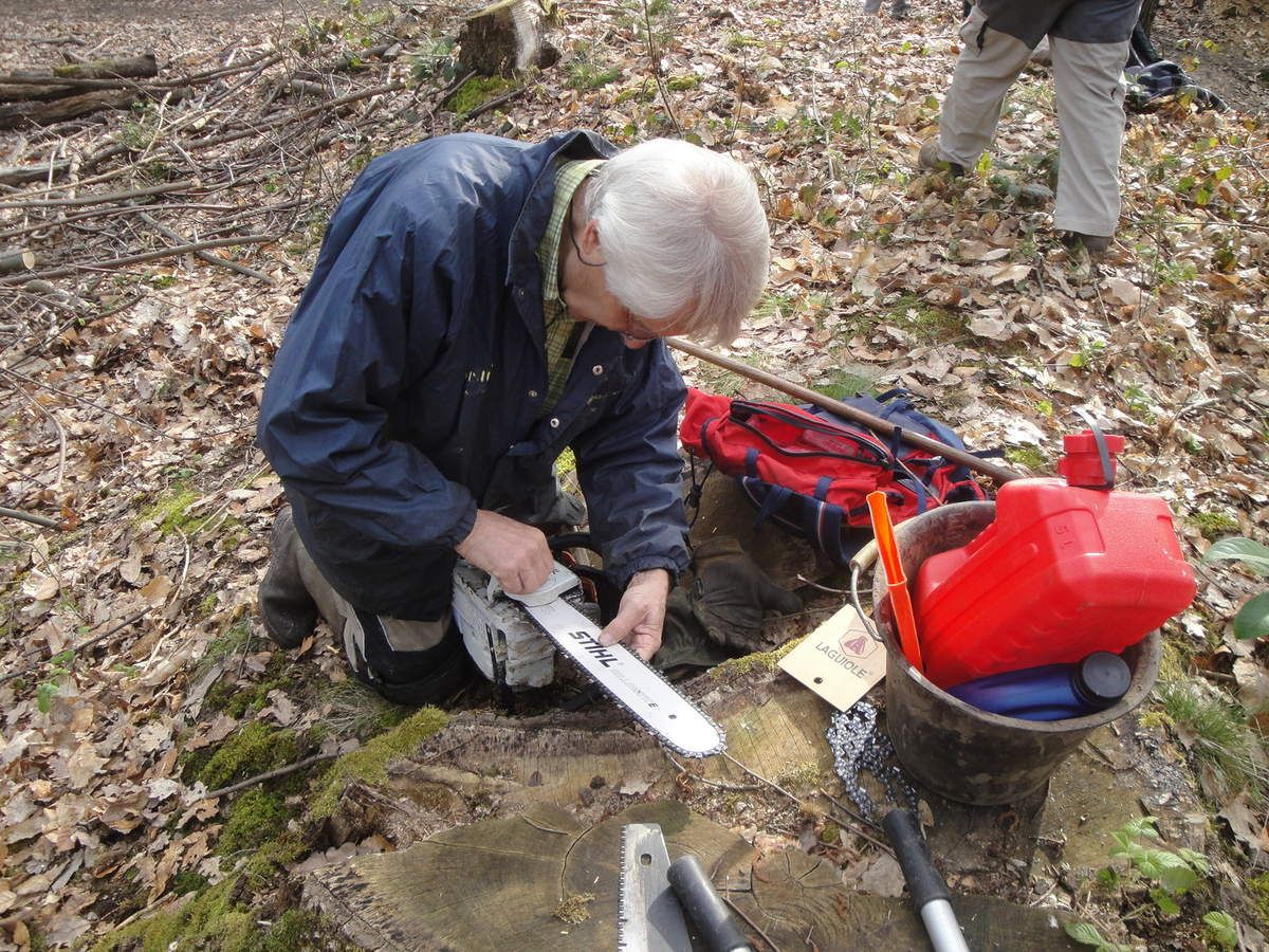 Pendant ce temps Silvère prépare la tronçonneuse pour tailler les arbres un peu plus en amont, Jean (à gauche-celui qui a découvert le dalot) et Claude dégagent de gros tronçons d'arbres, à l'arrière plan on distingue Bernard et Monique, défricheurs depuis les origines de l'ARHYME.
